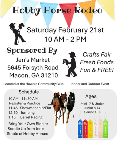 Grab your Hobby Horse and come try your skills at barrel racing, jumping, showmanship and more. If weather is good we will be in the outside "arena", if too cold/wet we will prance to the inside "arena"!